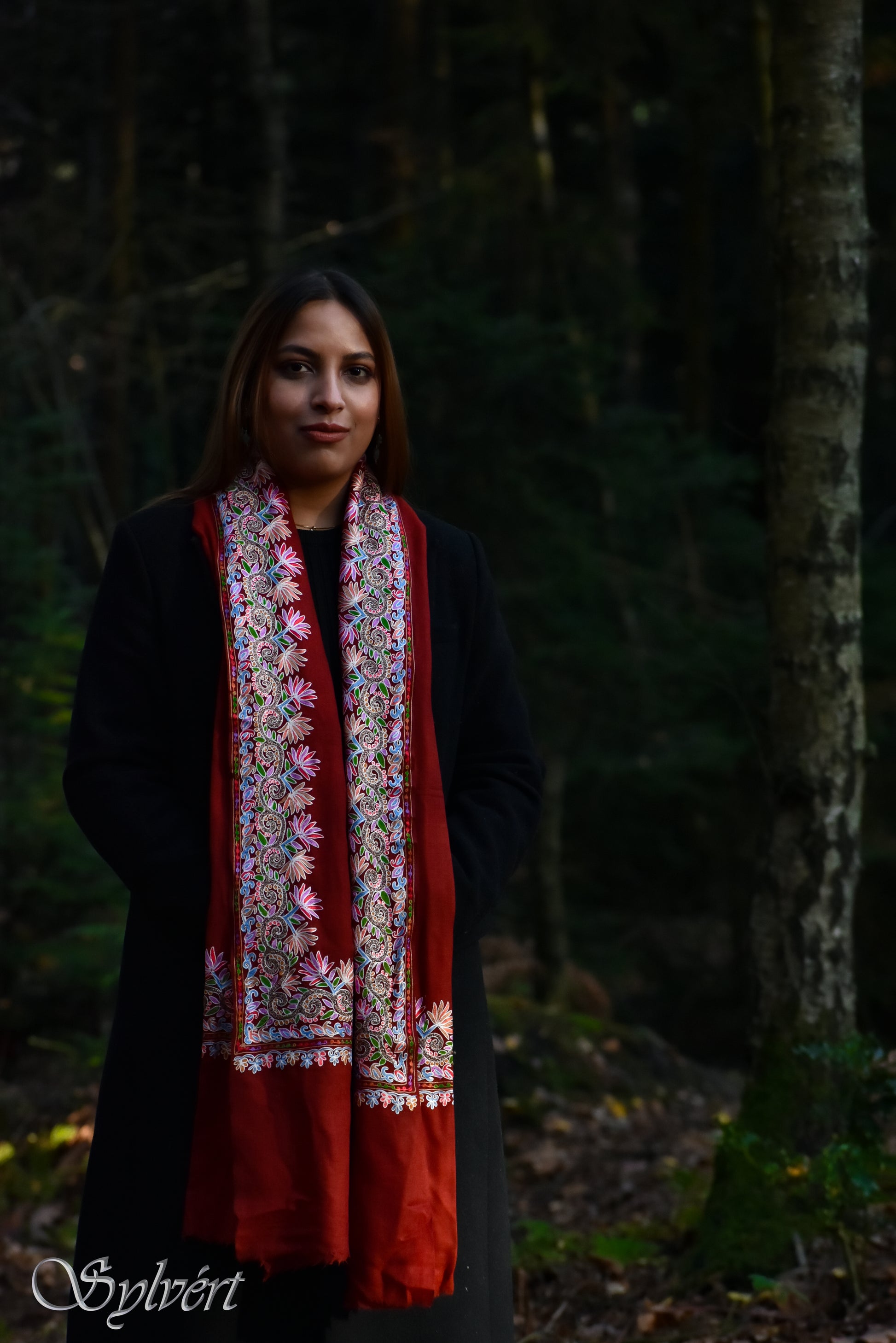 The Rivan stole is an ode to heritage elevated through restraint and finesse. Crafted from the finest grade of featherlight cashmere, this piece is adorned with vibrant PapierMâché-style hand embroidery - a signature of Kashmiri artisanship where bold floral motifs and arabesques are rendered in finely laid satin threads.